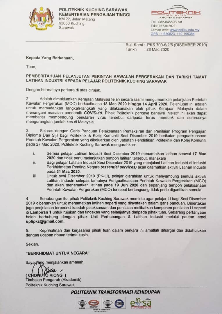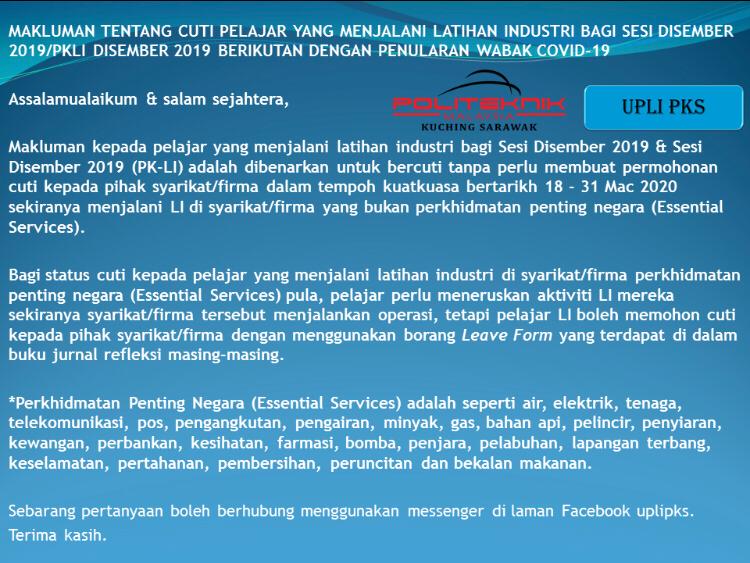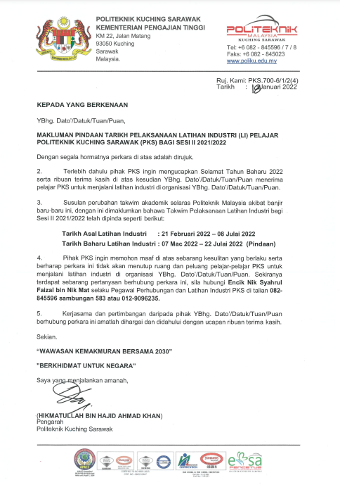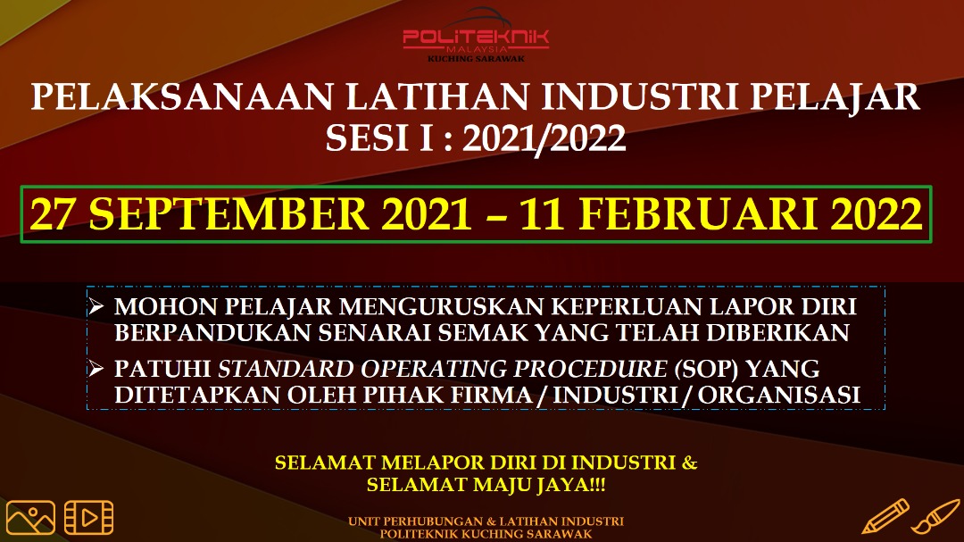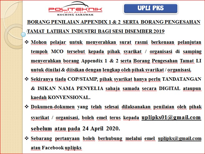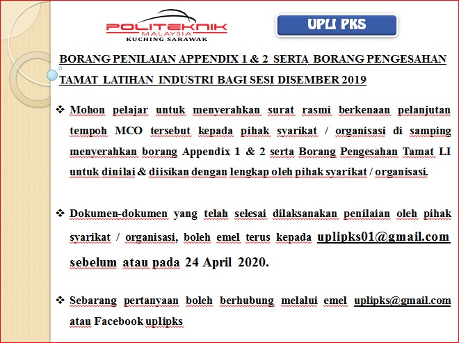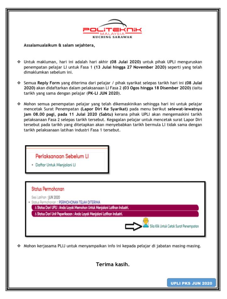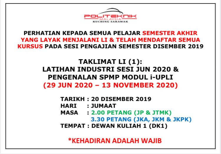 Untuk makluman tiada pertukaran tempat LI di benarkan memandangkan semua surat rasmi dari Politeknik Kuching Sarawak telah di hantar ke pihak syarikat. Penempatan yang tertera pada SPMP adalah muktamad. Sila hadir ke syarikat yang dinyatakan mengikut tarikh dan masa yang telah ditetapkan.