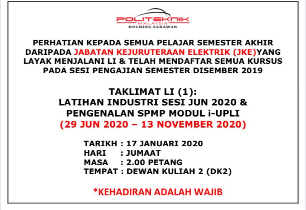 Bagi pelajar yang belum mendapat tempat, mohon mendapatkan dengan segera dan sila berhubung dengan penyelaras Latihan Industri di jabatan masing-masing untuk makluman lanjut/bantuan. Kegagalan menjalani LI pada tempoh yang di tetapkan boleh menjejaskan keputusan LI anda.