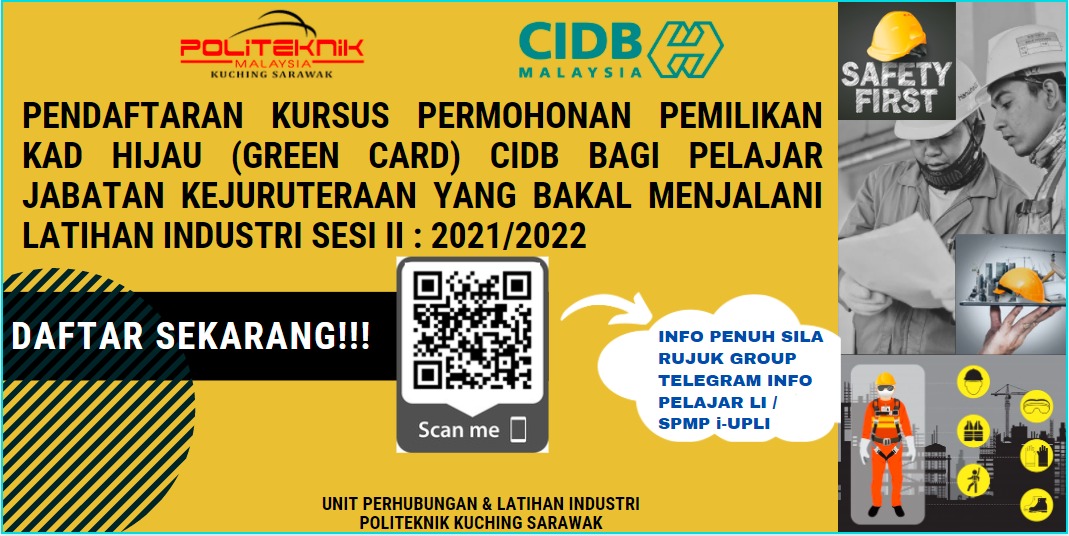 Sukacita dimaklumkan bahawa taklimat mendaftar Kursus Induksi Keselamatan dan Kesihatan di tapak bina untuk pendaftaran Personel Binaan (Kad Hijau) dalam Sistem Lembaga Pembangunan Industri Pembinaan (CIDB) akan diadakan secara atas talian. Bagi pelajar yang ingin menyertai kursus tersebut sila hadirkan diri mengikut ketetapan seperti berikut :